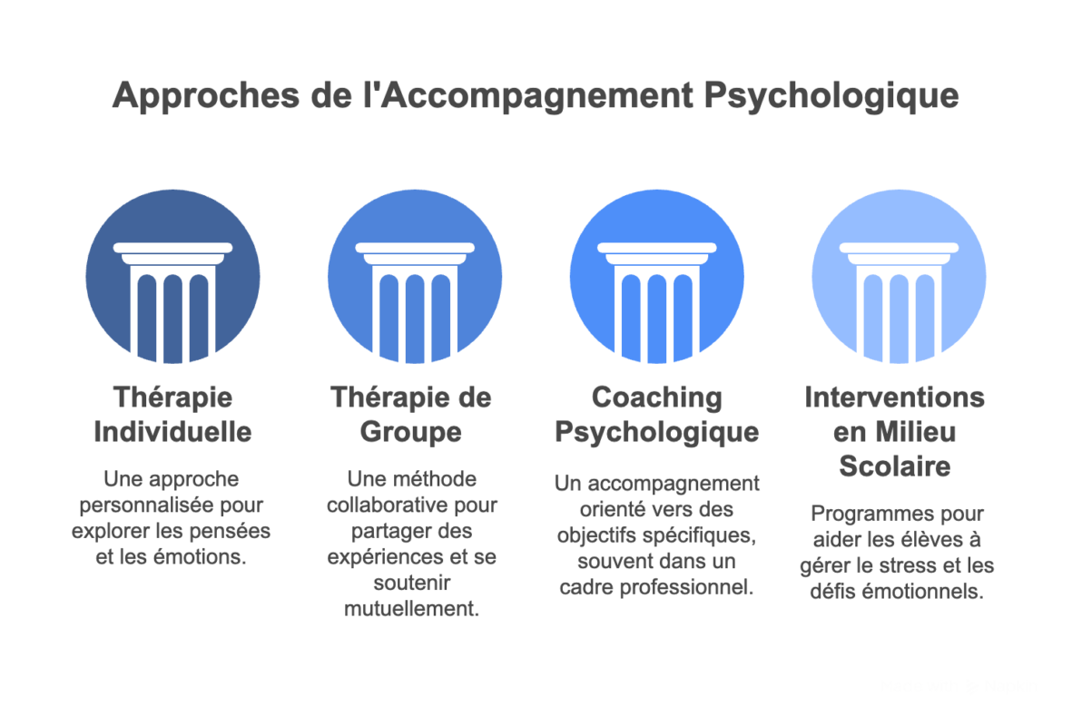 Il existe plusieurs approches et méthodes d’accompagnement psychologique, parmi lesquelles :