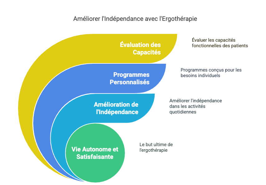 L’ergothérapie vise à aider les individus à retrouver ou à développer des compétences nécessaires pour mener une vie autonome et satisfaisante. Les ergothérapeutes évaluent les capacités fonctionnelles des patients et conçoivent des programmes personnalisés pour améliorer leur indépendance dans les activités quotidiennes, que ce soit à la maison, au travail ou dans la communauté.